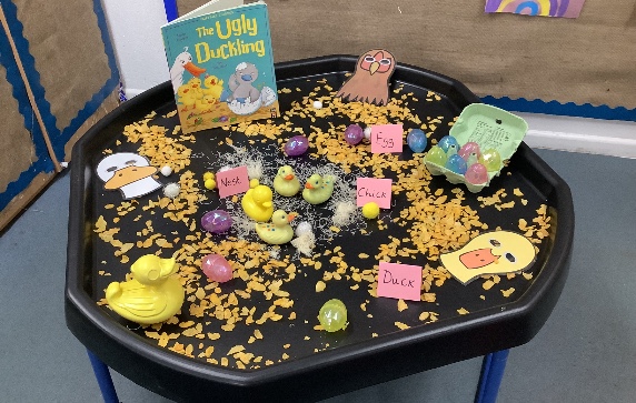 They have explored the tuft tray with interest as this was themed around the story of "The Ugly Duckling" and have been recreating parts of the story in their play.