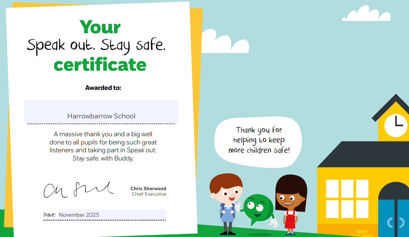 We completed our participation in this NSPCC programme that helps children to understand what they can do if they feel unsafe, uncomfortable or worried about something. As well as learning to speak to a trusted adult, either at school or at home, they learnt about how Childline can help them. The school has been awarded the certificate below in recognition of our efforts to help keep children safe. If you get the opportunity, please ask your child if they can remember the Childline number and don't be surprised when they recall it with the aid of some helpful actions - they really paid attention to the important messaging.