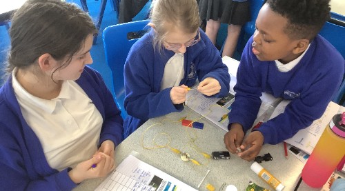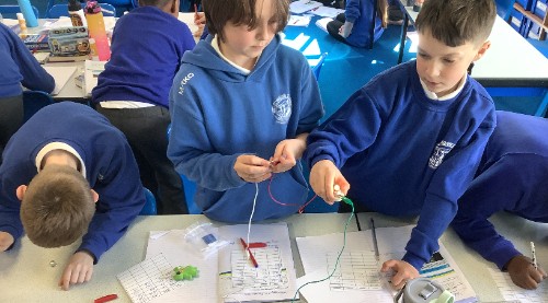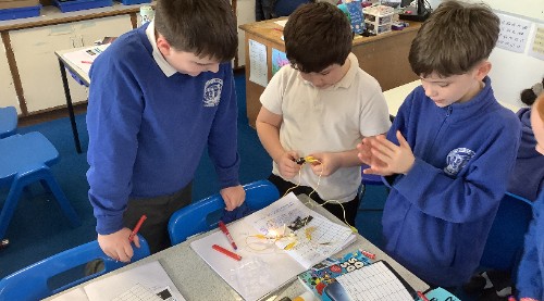 In science, we investigated with voltage and the effect this has on a series circuit. We tried different amounts of cells, motors, wires and bulbs to see what would happen. We also discovered that a circuit with a 1.5v cell and one bulb would still work even with 27 wires - it was a very dim light though.