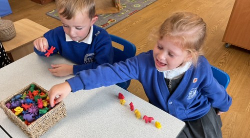 In Maths, we explored repeating patterns, using colours, shapes and objects to create our own designs. The children worked so carefully, spotting what comes next and proudly sharing their patterns with friends.